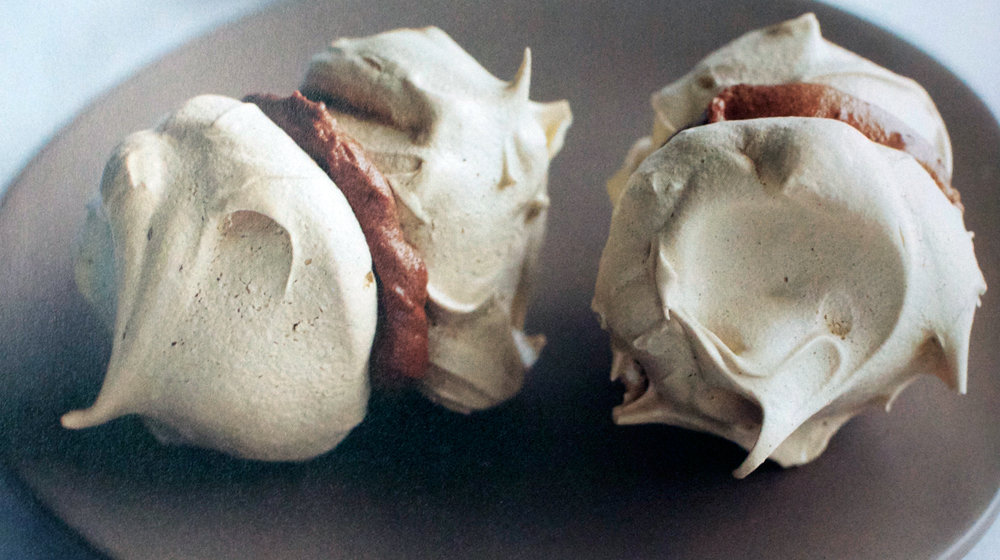 For the filling, melt the chocolate in a small pan over medium heat. Whip the cream in a bowl until it holds in soft peaks. Now stir in the chocolate and the icing sugar. The cream should firm-up as the chocolate cools and sets. Wait until the mixture is firm enough to sandwich a pair of meringues together.
